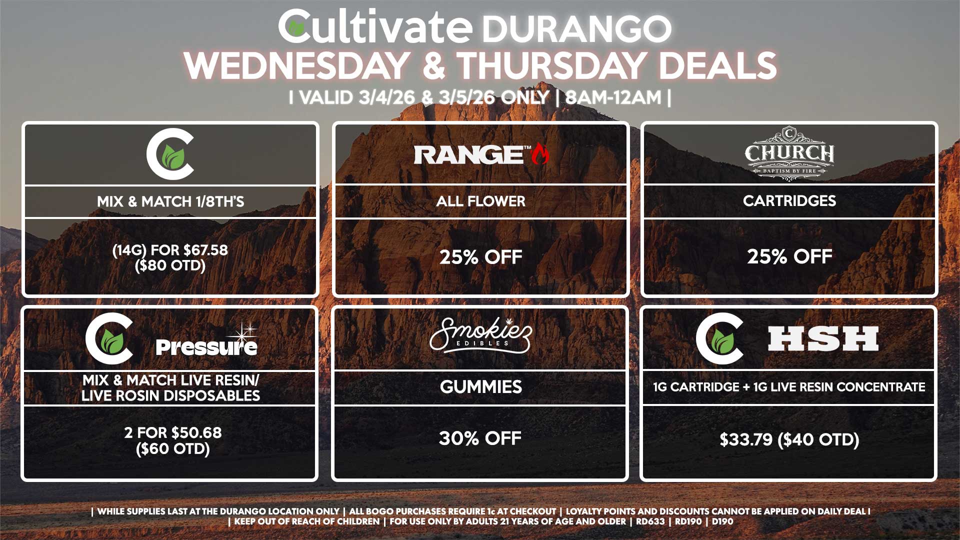 Cultivate Las Vegas DURANGO Dispensary Daily Deals! Valid WEDNESDAY & THURSDAY 3/4-3/5 Only | 8AM-12AM | While Supplies Last!
