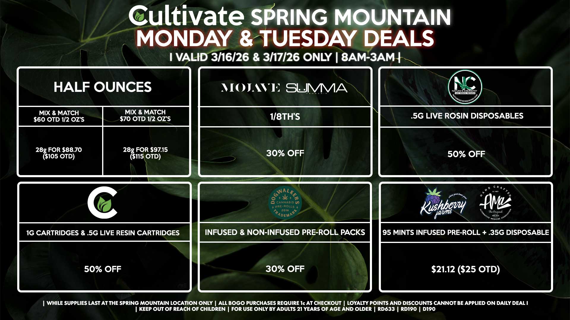 Cultivate Las Vegas SPRING MOUNTAIN Dispensary Daily Deals! Valid MONDAY & TUESDAY 3/16-3/17 Only | 8AM-3AM | While Supplies Last!
