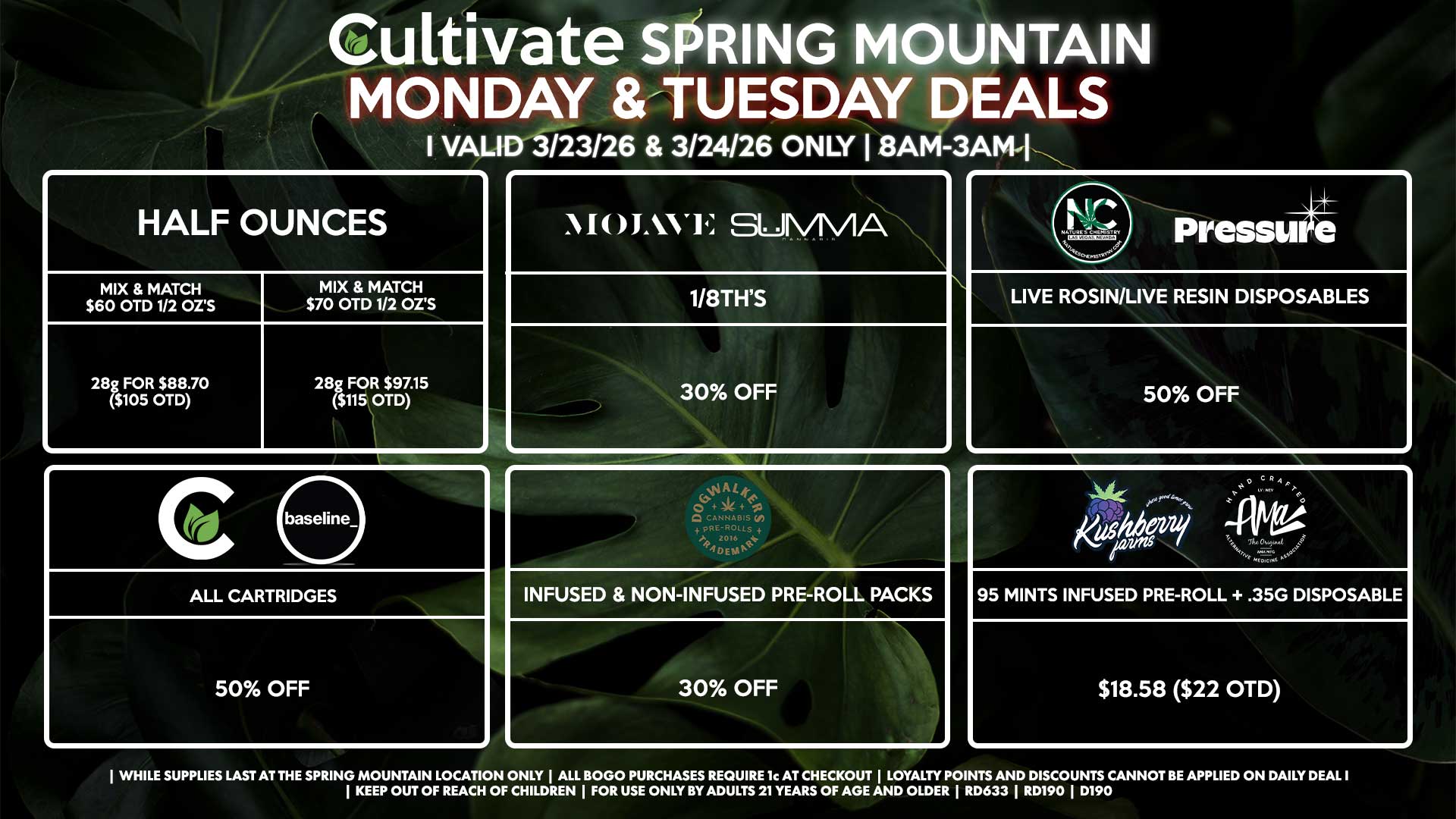 Cultivate Las Vegas SPRING MOUNTAIN Dispensary Daily Deals! Valid MONDAY & TUESDAY 3/23-3/24 Only | 8AM-3AM | While Supplies Last!