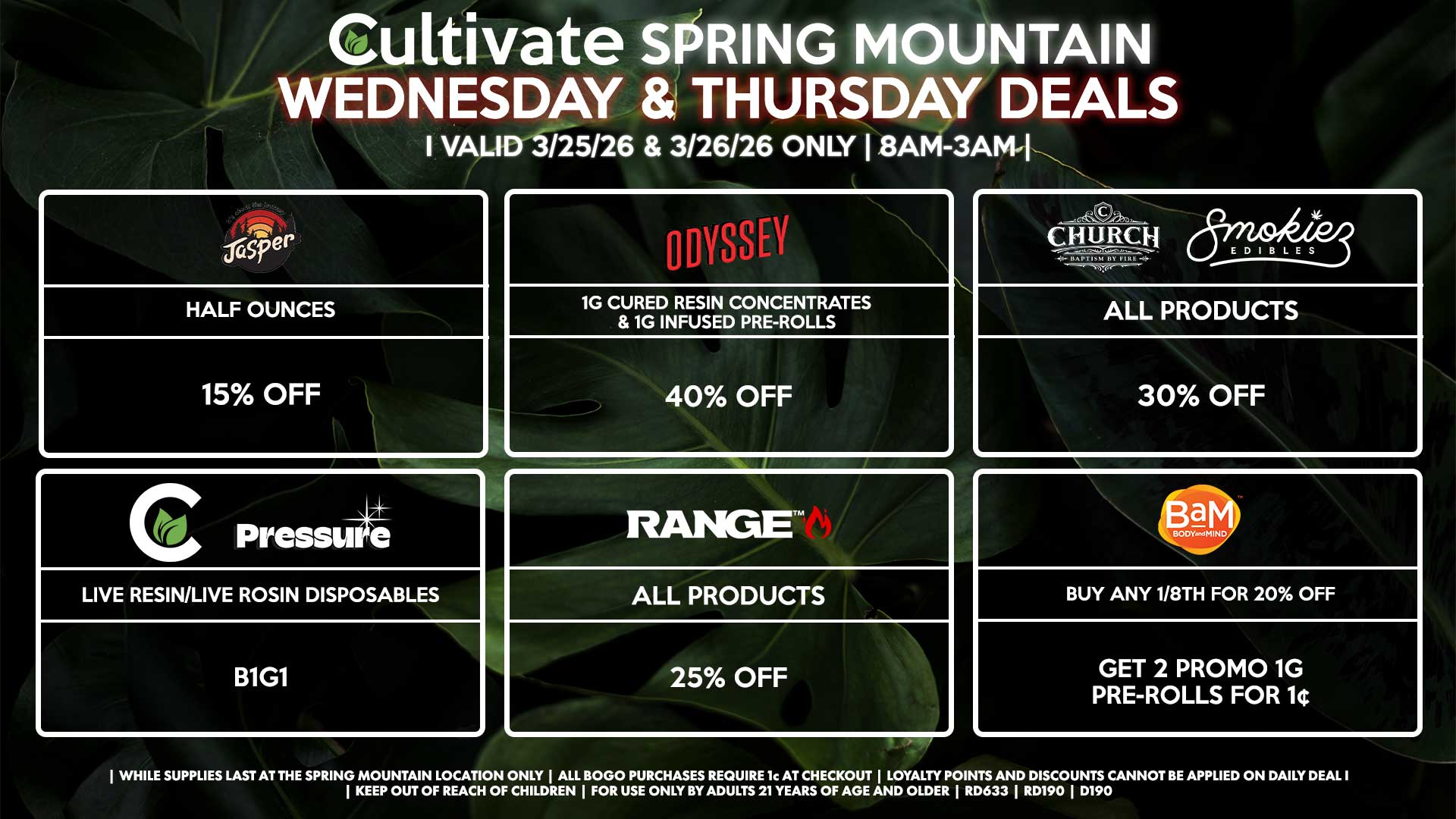 Cultivate Las Vegas SPRING MOUNTAIN Dispensary Daily Deals! Valid WEDNESDAY & THURSDAY 3/25-3/26 Only | 8AM-3AM | While Supplies Last!