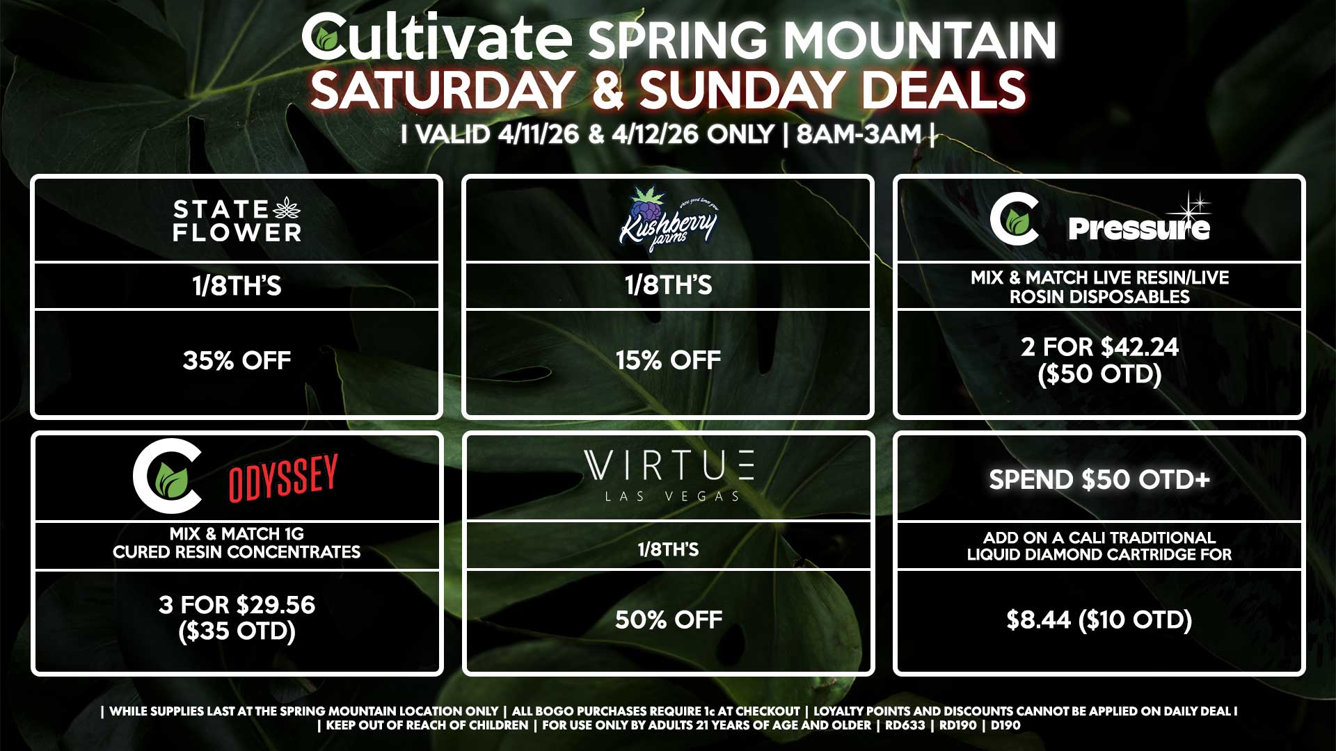 Cultivate Las Vegas SPRING MOUNTAIN Dispensary Daily Deals! Valid SATURDAY & SUNDAY 4/11-4/12 Only | 8AM-3AM | While Supplies Last!