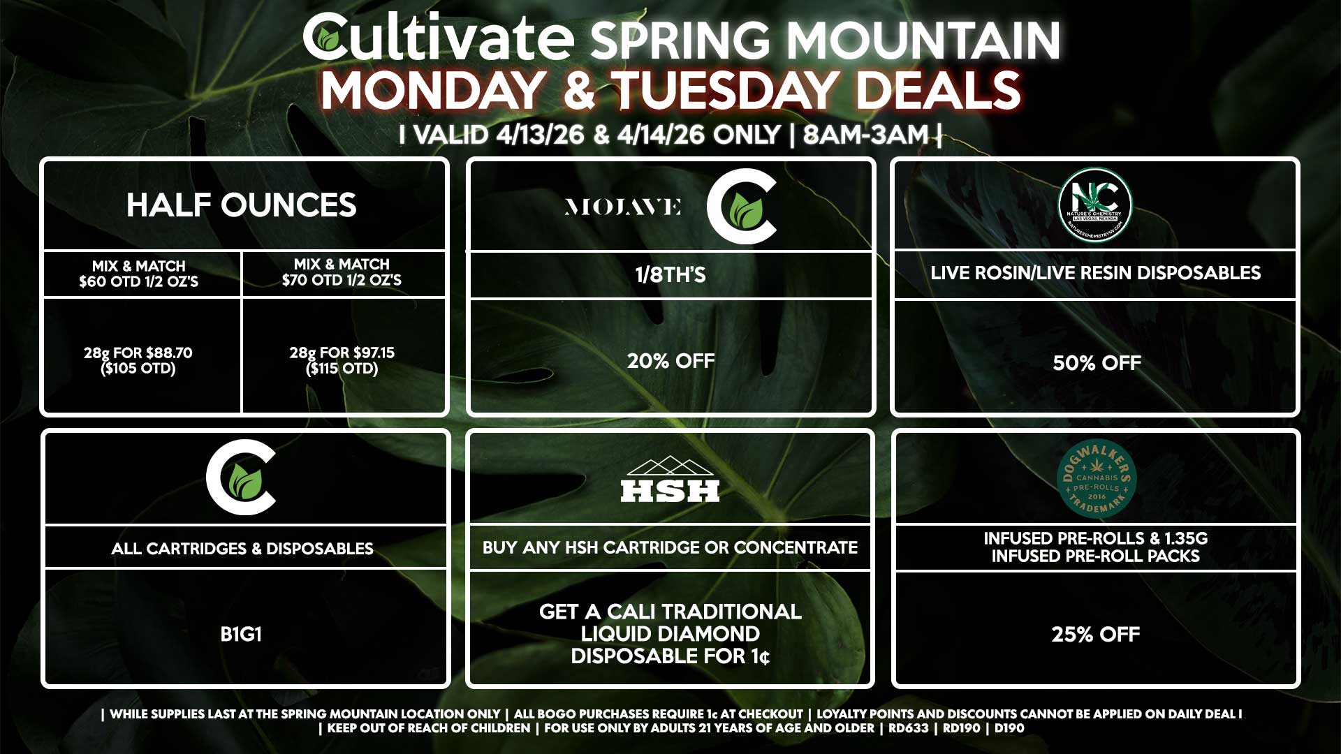 Cultivate Las Vegas SPRING MOUNTAIN Dispensary Daily Deals! Valid MONDAY & TUESDAY 4/13-4/14 Only | 8AM-3AM | While Supplies Last!
