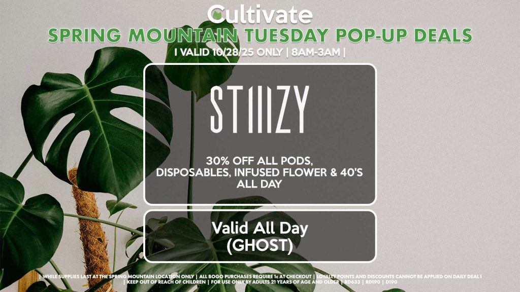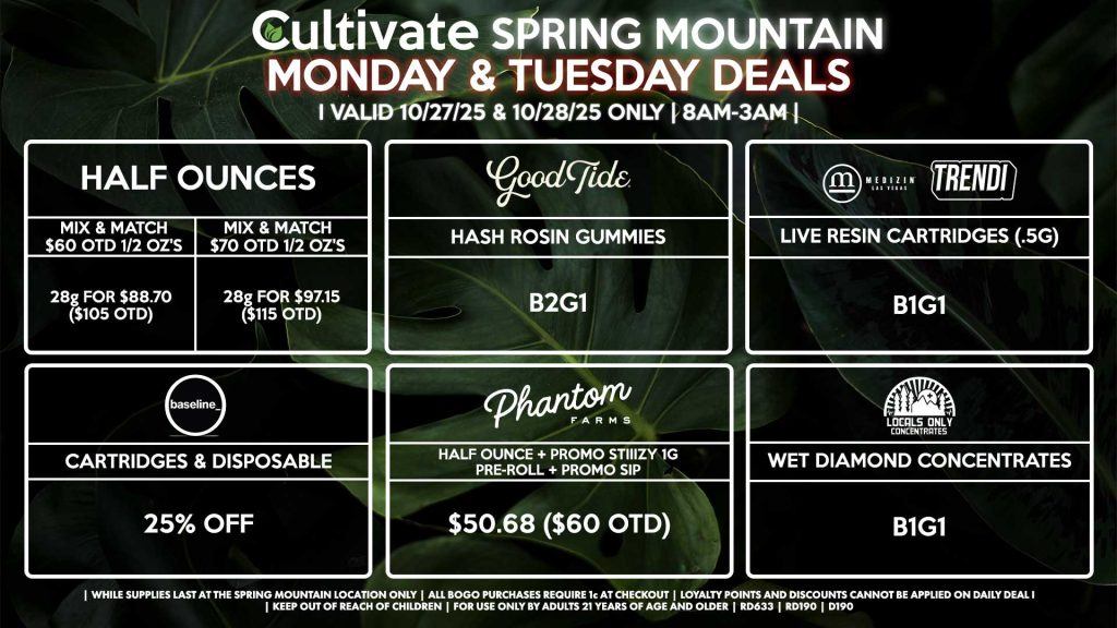 | Valid Monday (10/27/25) and Tuesday (10/28/25) at the Spring Mountain Location only, while supplies last | All BOGO purchases require 1¢ at checkout. | All deals include tax | Keep out of reach of children. For use only by adults 21 years of age and older. | Open 8AM to 3AM | Visit cultivatelv.com for more information |