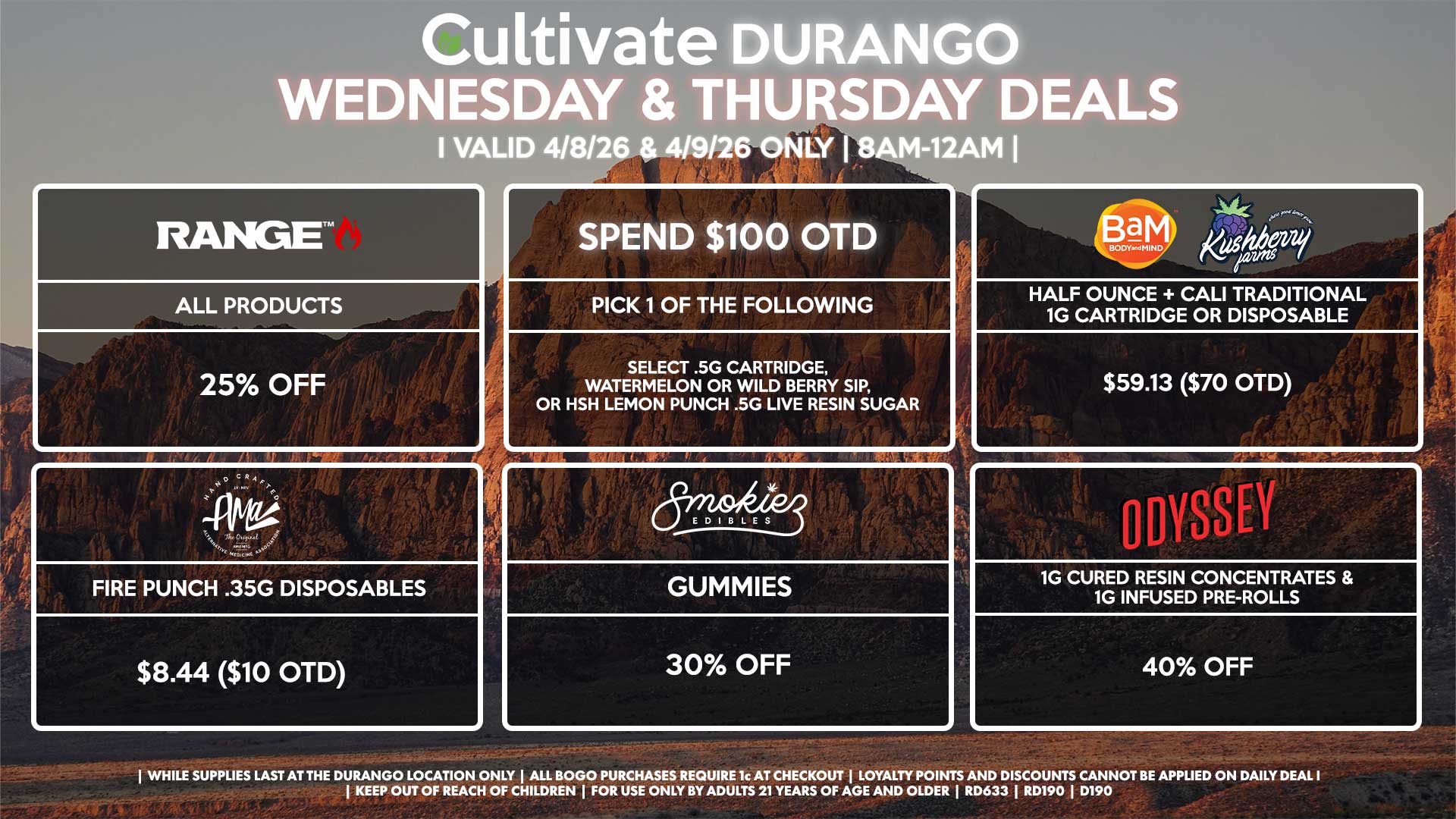 Cultivate Las Vegas DURANGO Dispensary Daily Deals! Valid WEDNESDAY & THURSDAY 4/8-4/9 Only | 8AM-12AM | While Supplies Last!