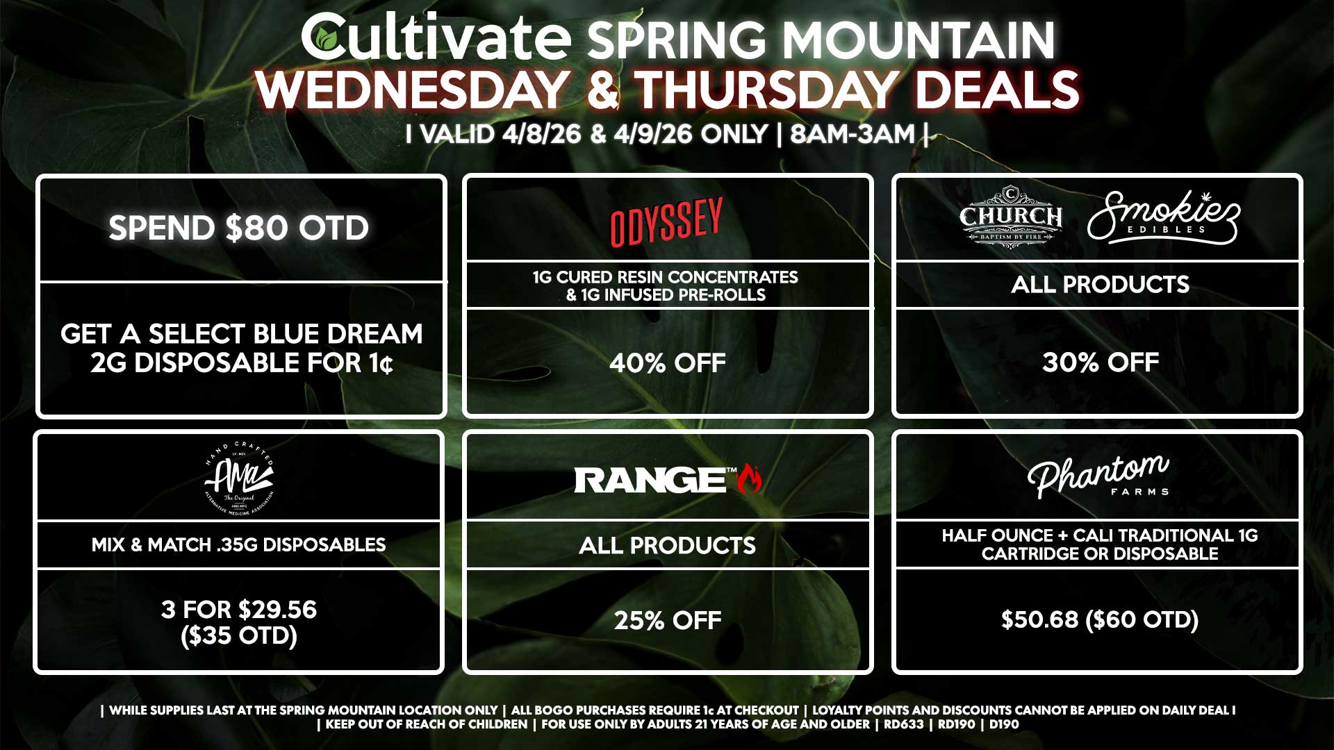 Cultivate Las Vegas SPRING MOUNTAIN Dispensary Daily Deals! Valid WEDNESDAY & THURSDAY 4/8-4/9 Only | 8AM-3AM | While Supplies Last!